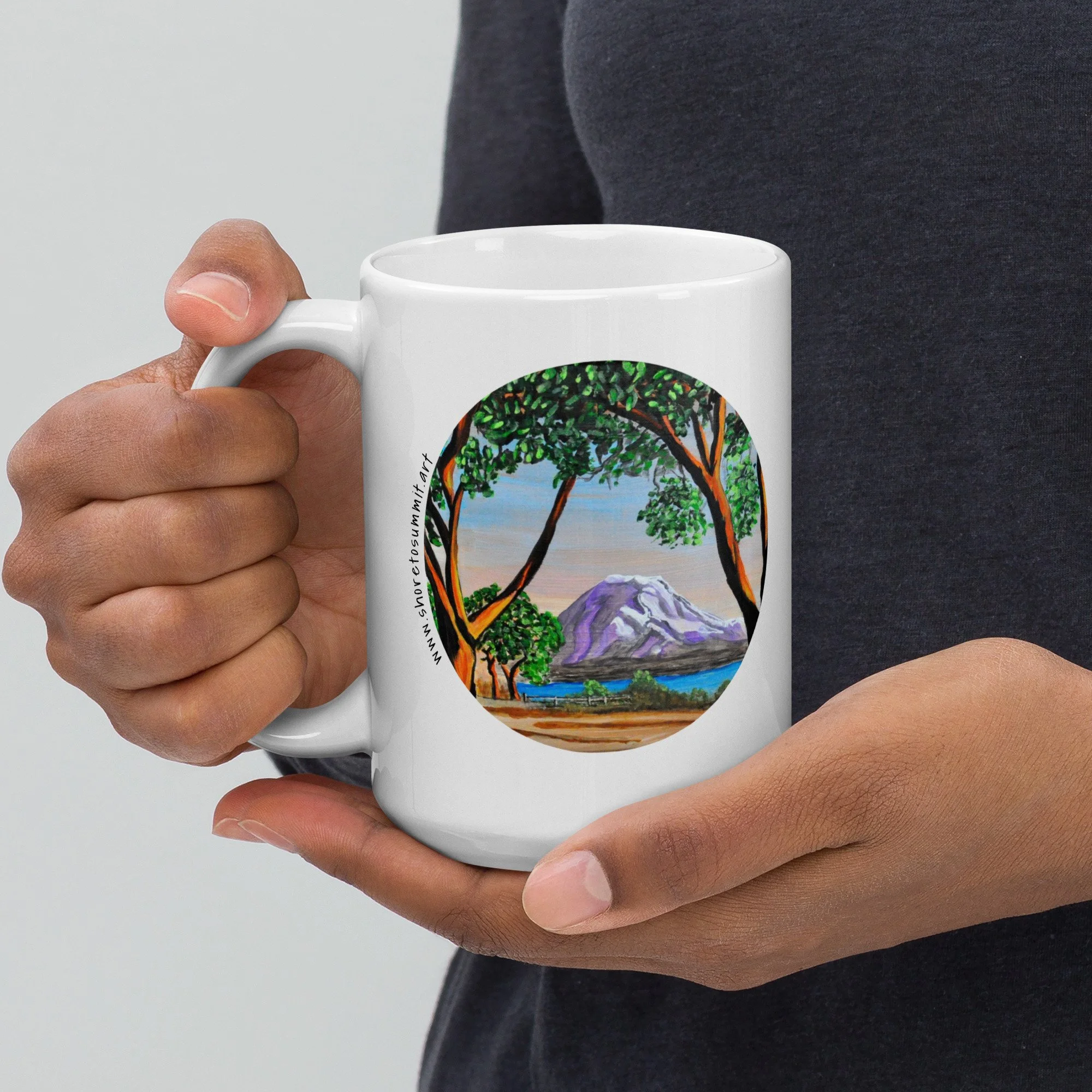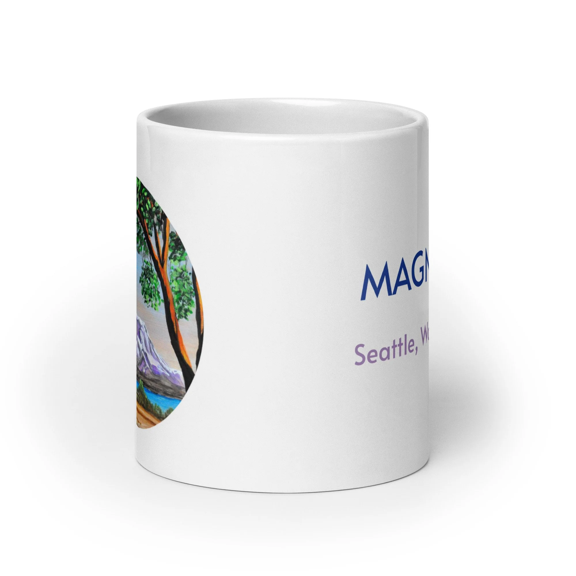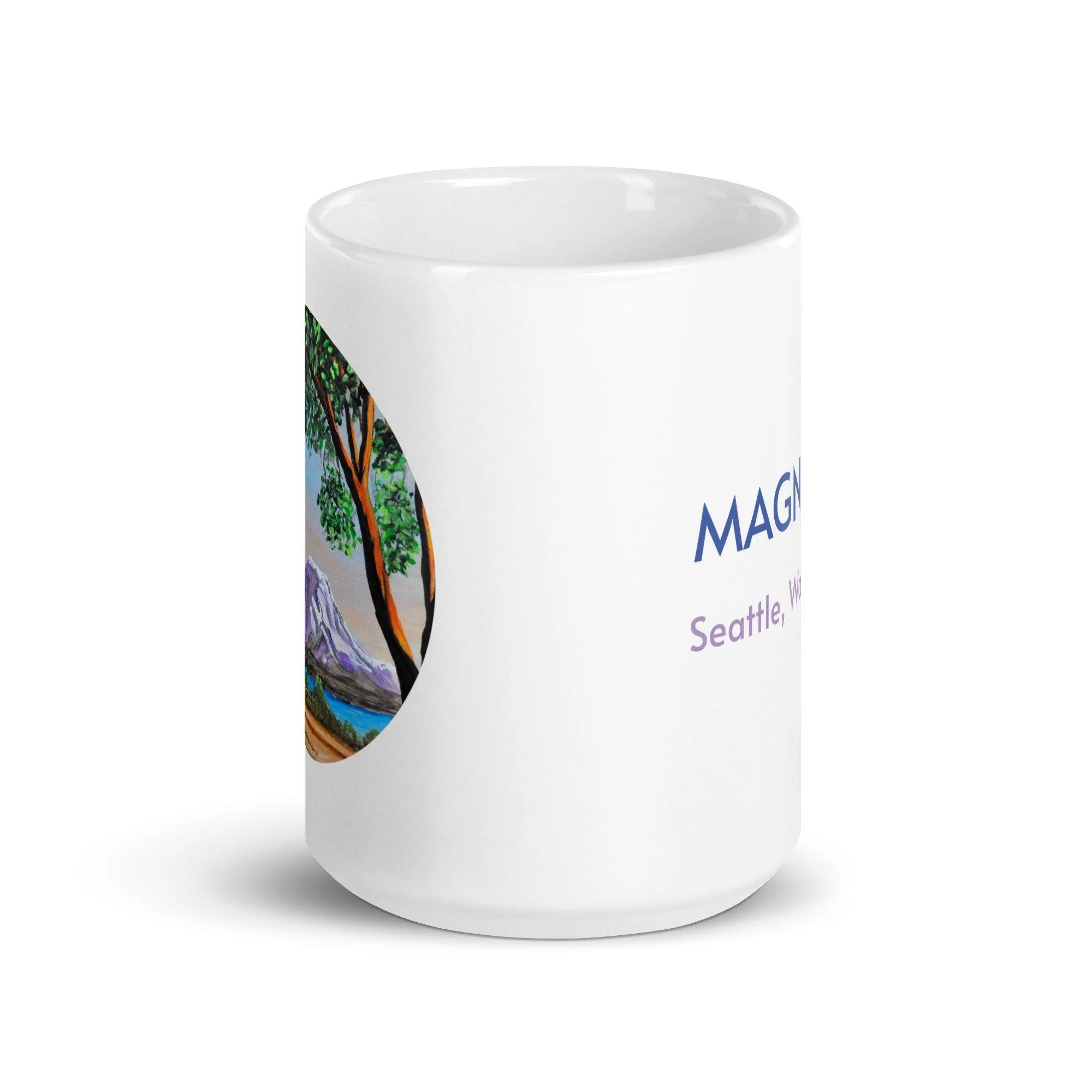 Whether it's used for morning coffee, evening tea, or something in between—this mug's perfect for you, sweet grandma or a friend! It's sturdy and glossy with a vivid print of an original painting of Mount Rainier captured between madrona trees in Seattle, Washington's Magnolia neighborhood.
