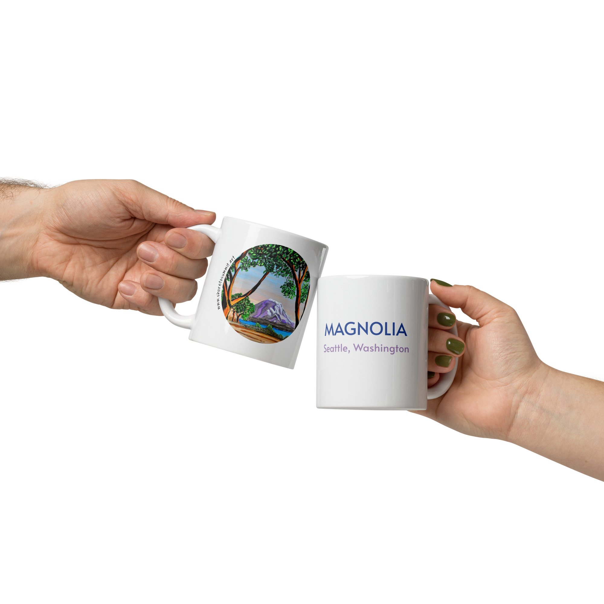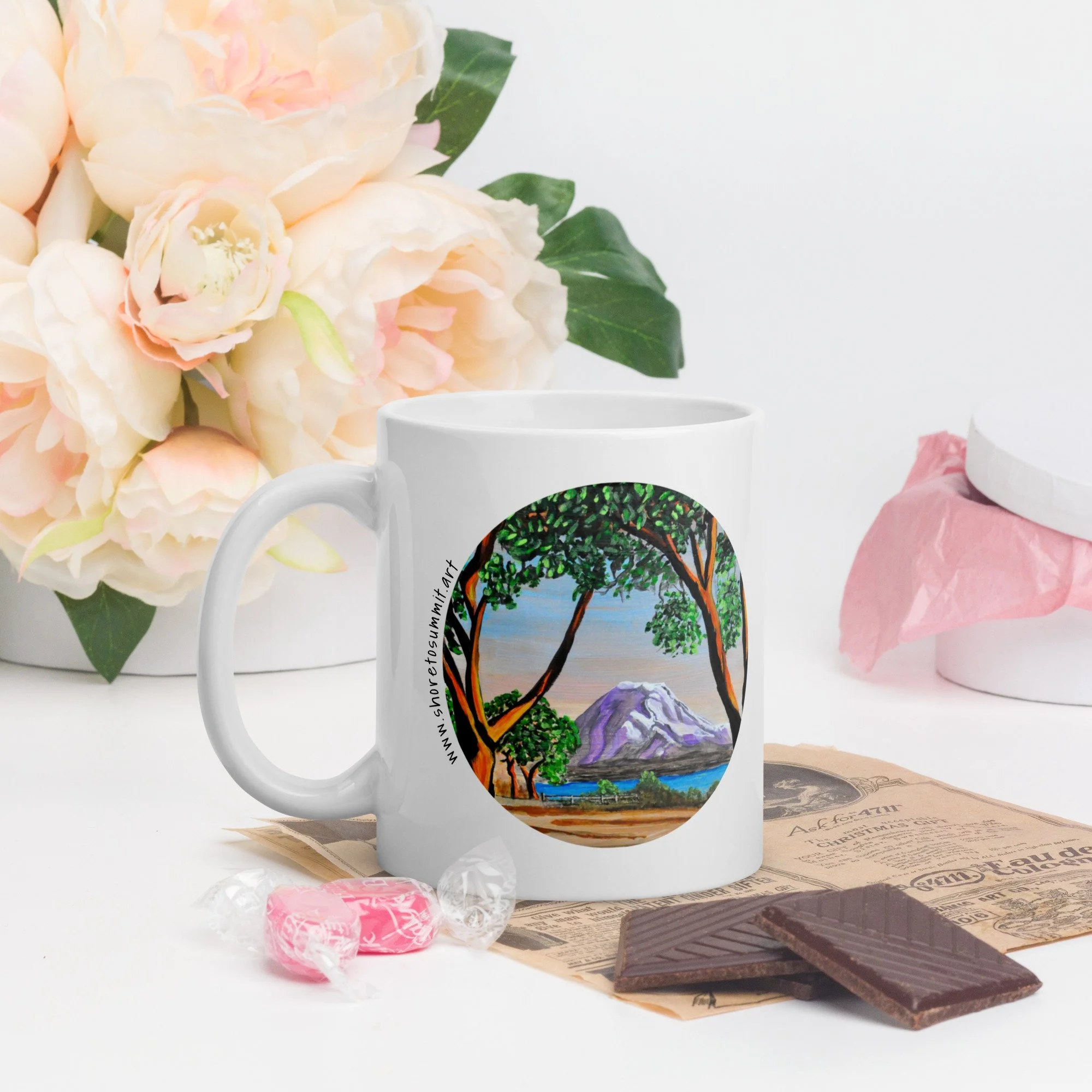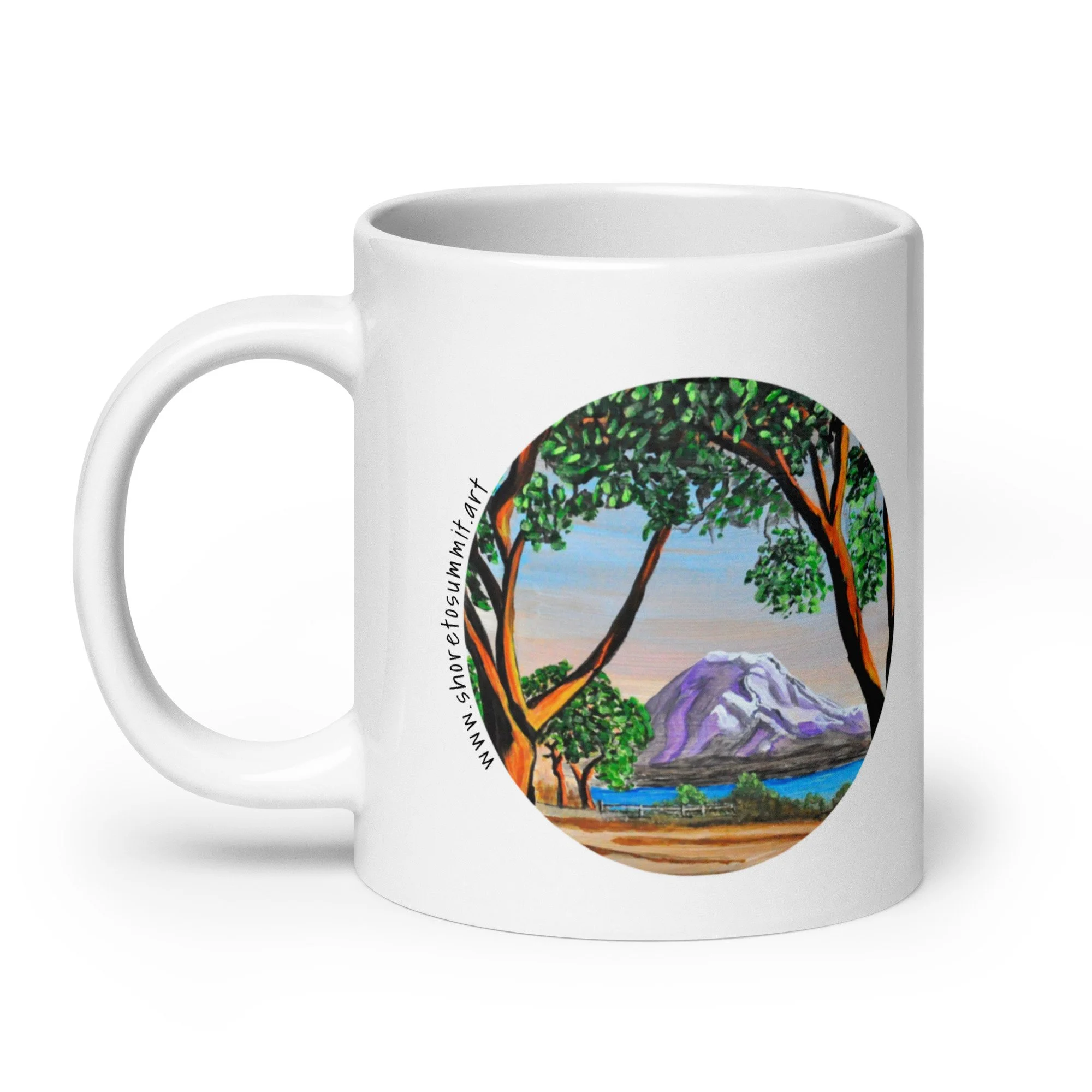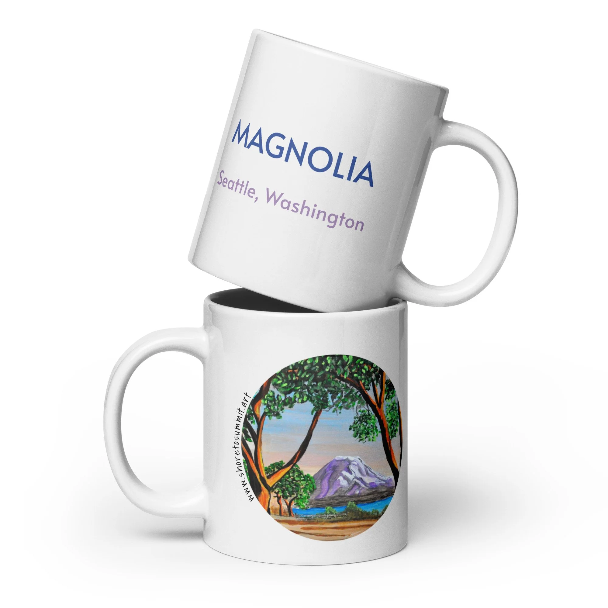 Whether it's used for morning coffee, evening tea, or something in between—this mug's perfect for you, sweet grandma or a friend! It's sturdy and glossy with a vivid print of an original painting of Mount Rainier captured between madrona trees in Seattle, Washington's Magnolia neighborhood.
