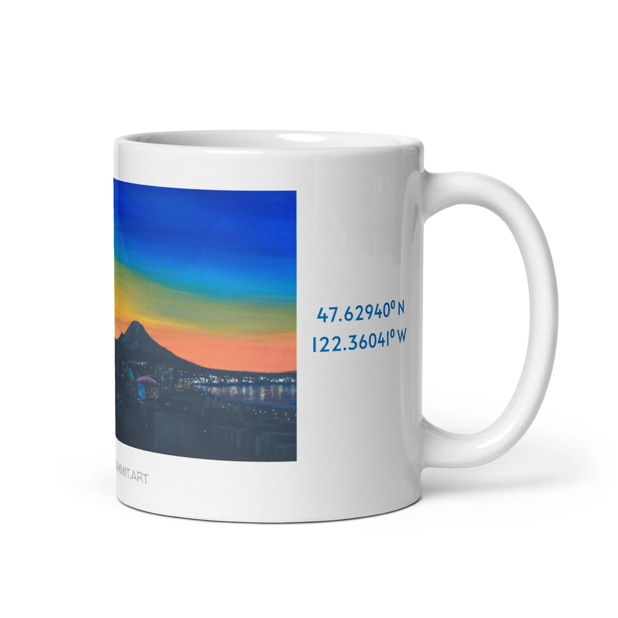 This mug will be a favorite for everyone who appreciates an original art "Seattle Sunrise" over downtown Seattle, the Space Needle and Mount Rainier painting printed on this glossy white mug. Share treasured memories of Seattle for years to come. The GPS coordinates will place you on a map where the original artwork inspiration was sparked. Adventure to that location and create your own special memories and story.